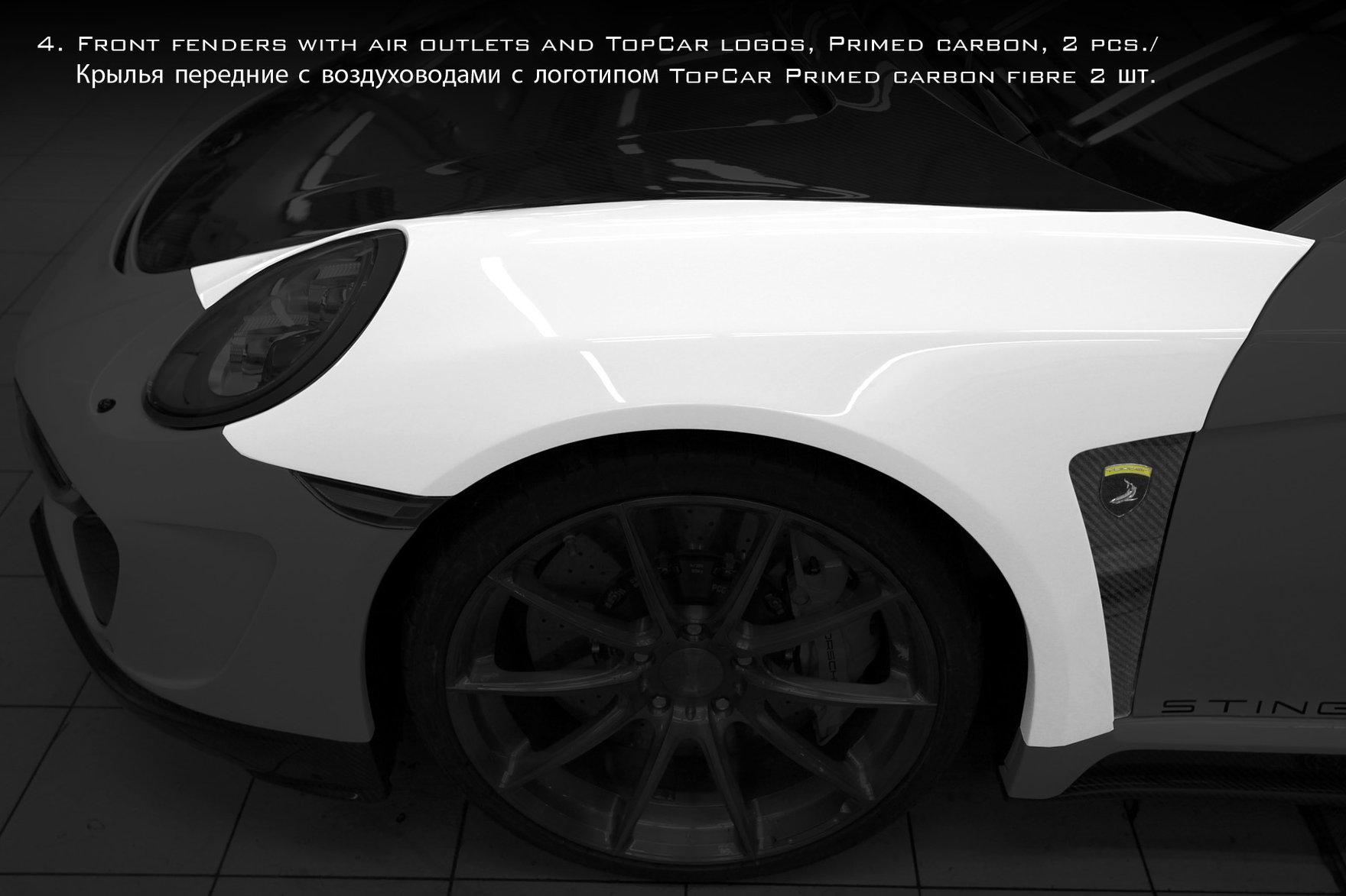 Upgrade your Porsche 911 991 Stinger GTR with our premium Front Fenders. These sleek fenders not only feature stylish air outtakes but also proudly display the iconic Topcar Design logos. Elevate your vehicle's aesthetics and performance with this must-have enhancement.