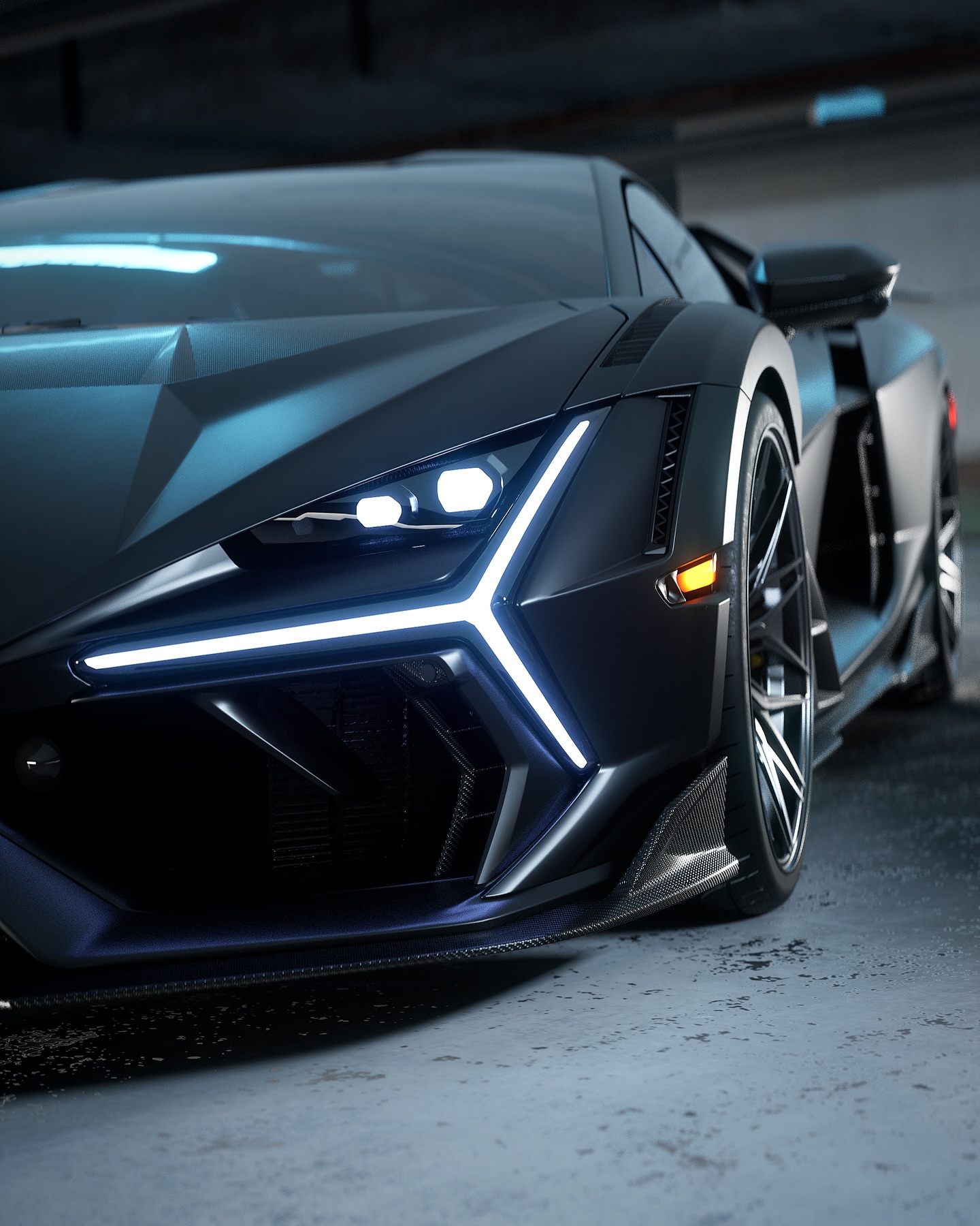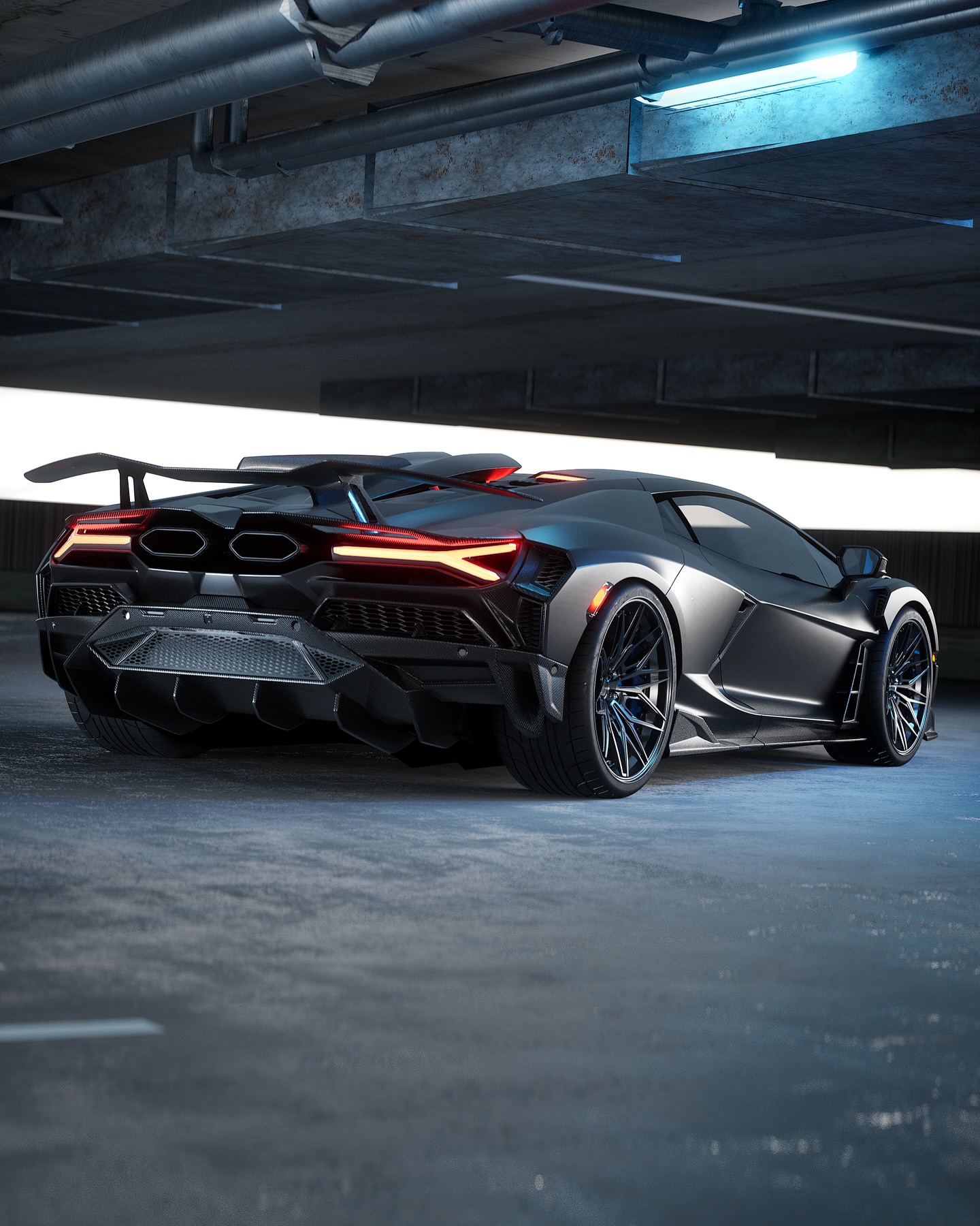 • Rear Diffuser with Integrated LED Strips: Deep diffuser inspired by Centenario, with LED-lit vertical fins for dramatic presence