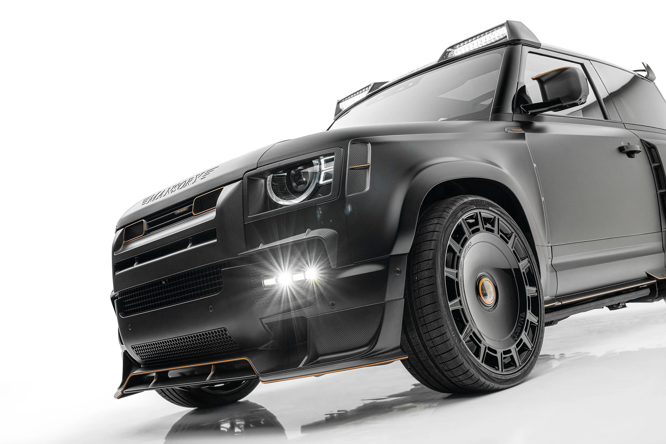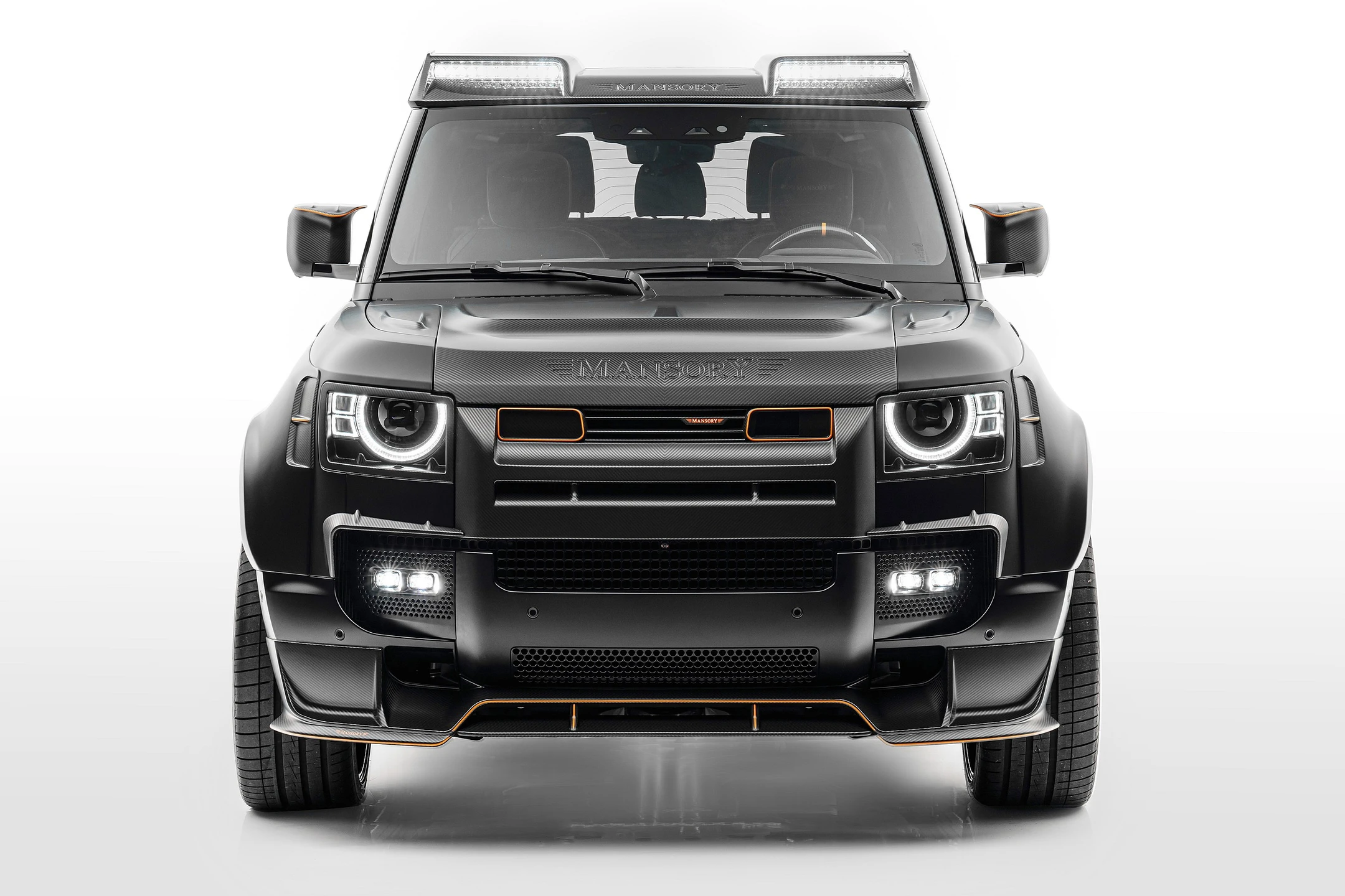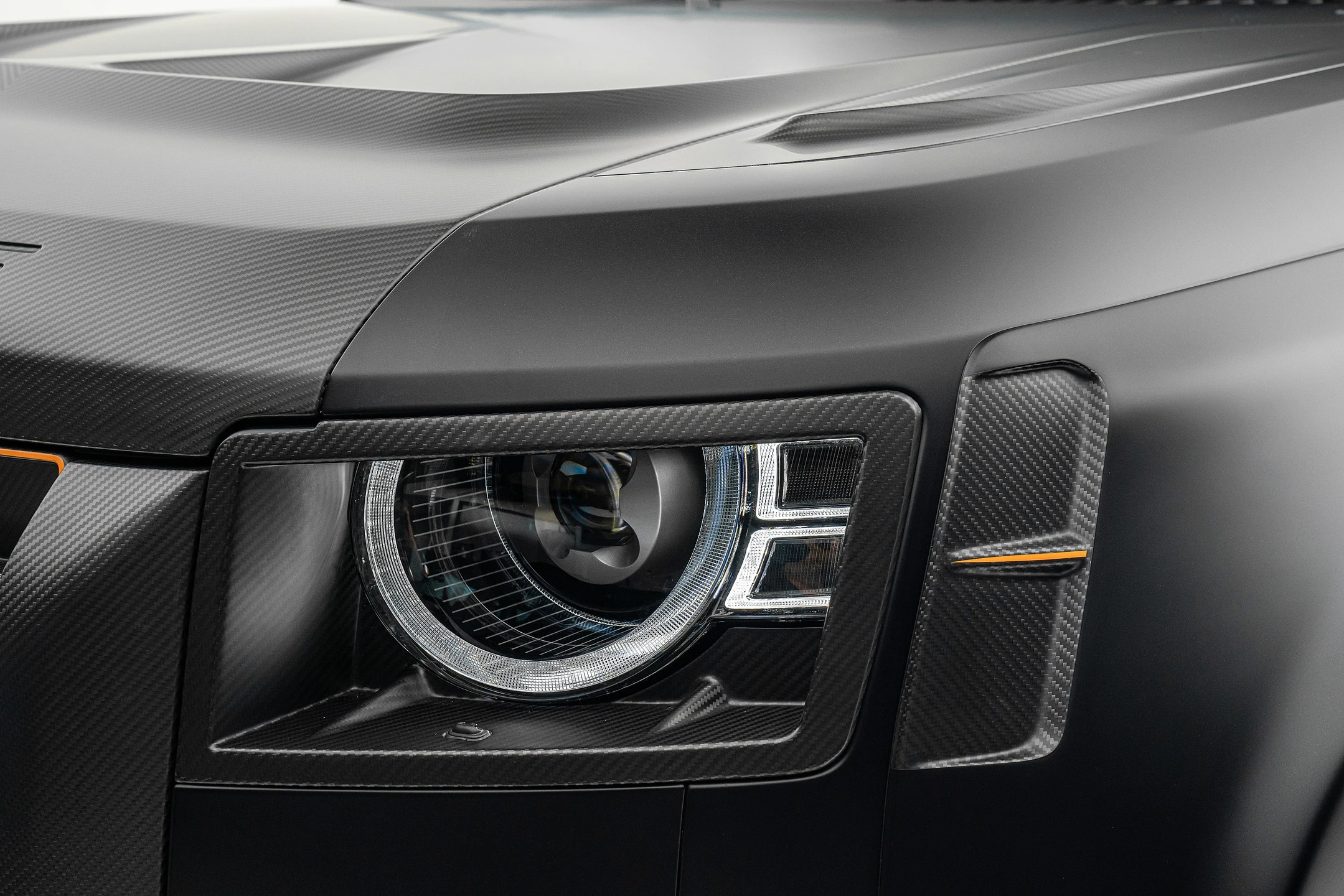 • Integrated LED DRLs, headlight surrounds, and roof light bar in carbon fiber offer dramatic illumination and style .